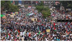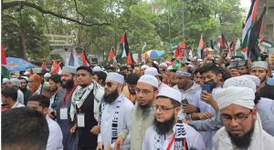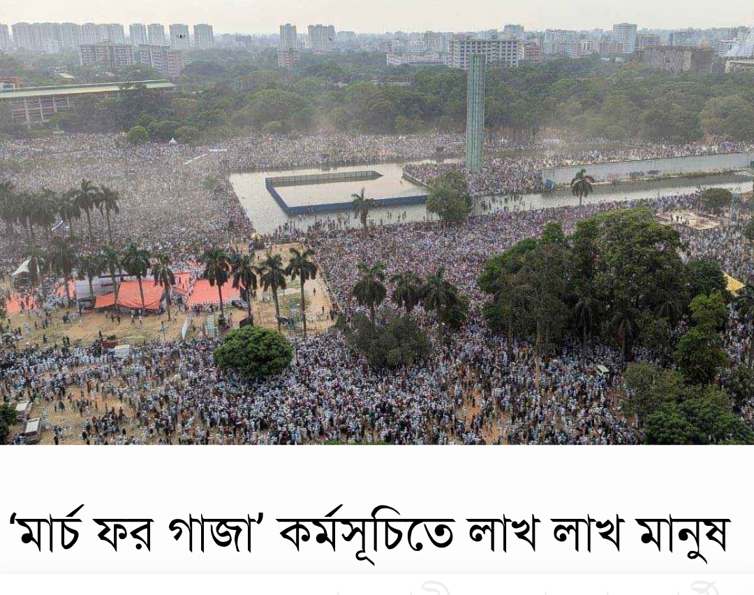 মার্চ ফর গাজা’ কর্মসূচিতে লাখ লাখ মানুষ সমবেত হয়েছেন রাজধানীর সোহরাওয়ার্দী উদ্যানে। ইতোমধ্যে সেখানে গণজমায়েত আনুষ্ঠানিকভাবে শুরু হয়েছে। প্যালেস্টাইন সলিডারিটি মুভমেন্ট বাংলাদেশের আয়োজনে এই অনুষ্ঠানে সভাপতিত্ব করছেন জাতীয় মসজিদ বায়তুল মোকাররমের খতিব মুফতি আব্দুল মালেক।