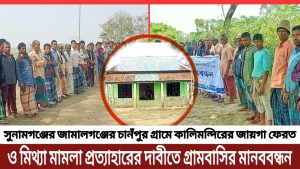 সুনামগঞ্জ জামালগঞ্জের কালিমন্দিরের জায়গা ফেরত ও মামলা প্রত্যাহারের দাবীতে মানববন্ধন